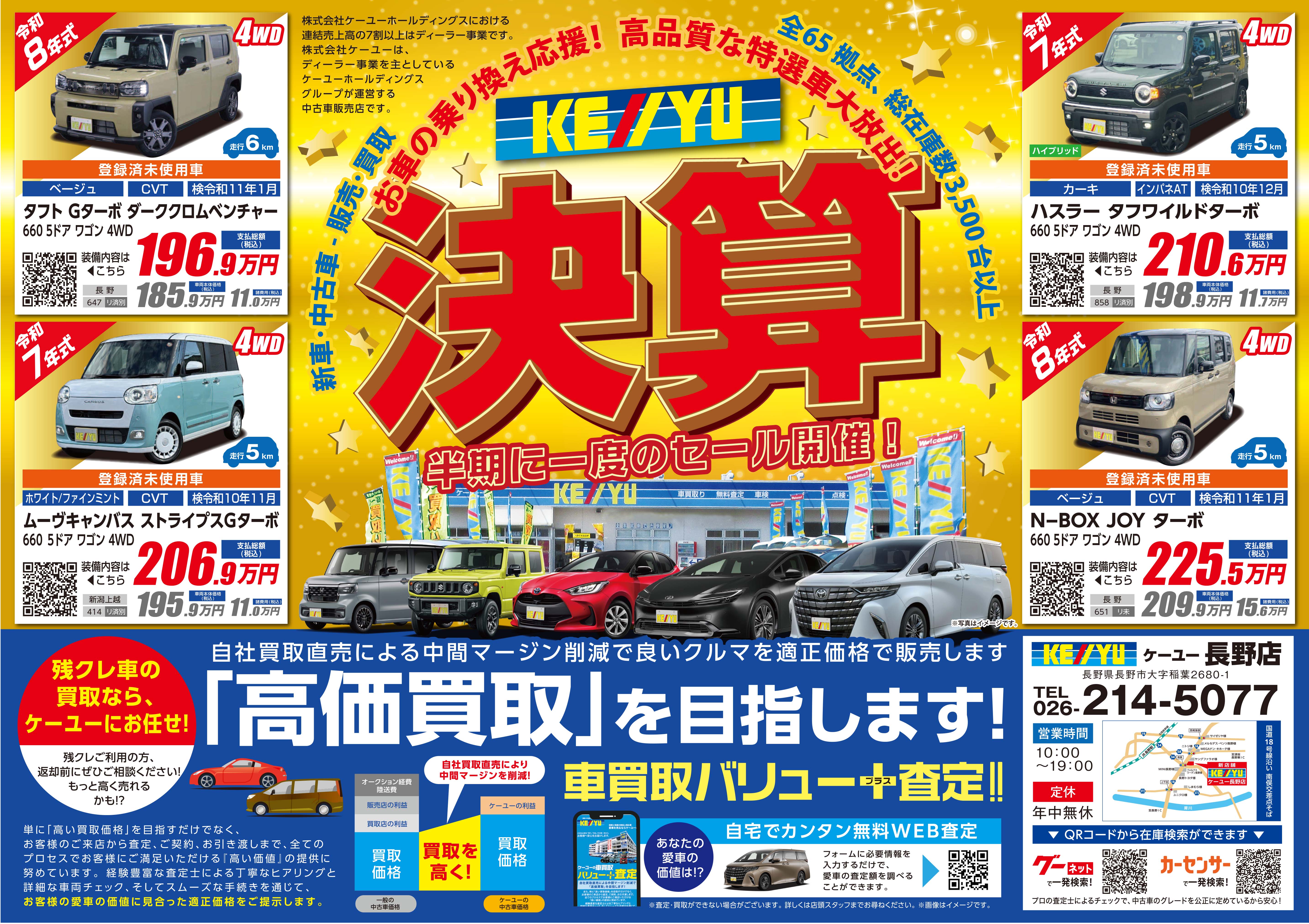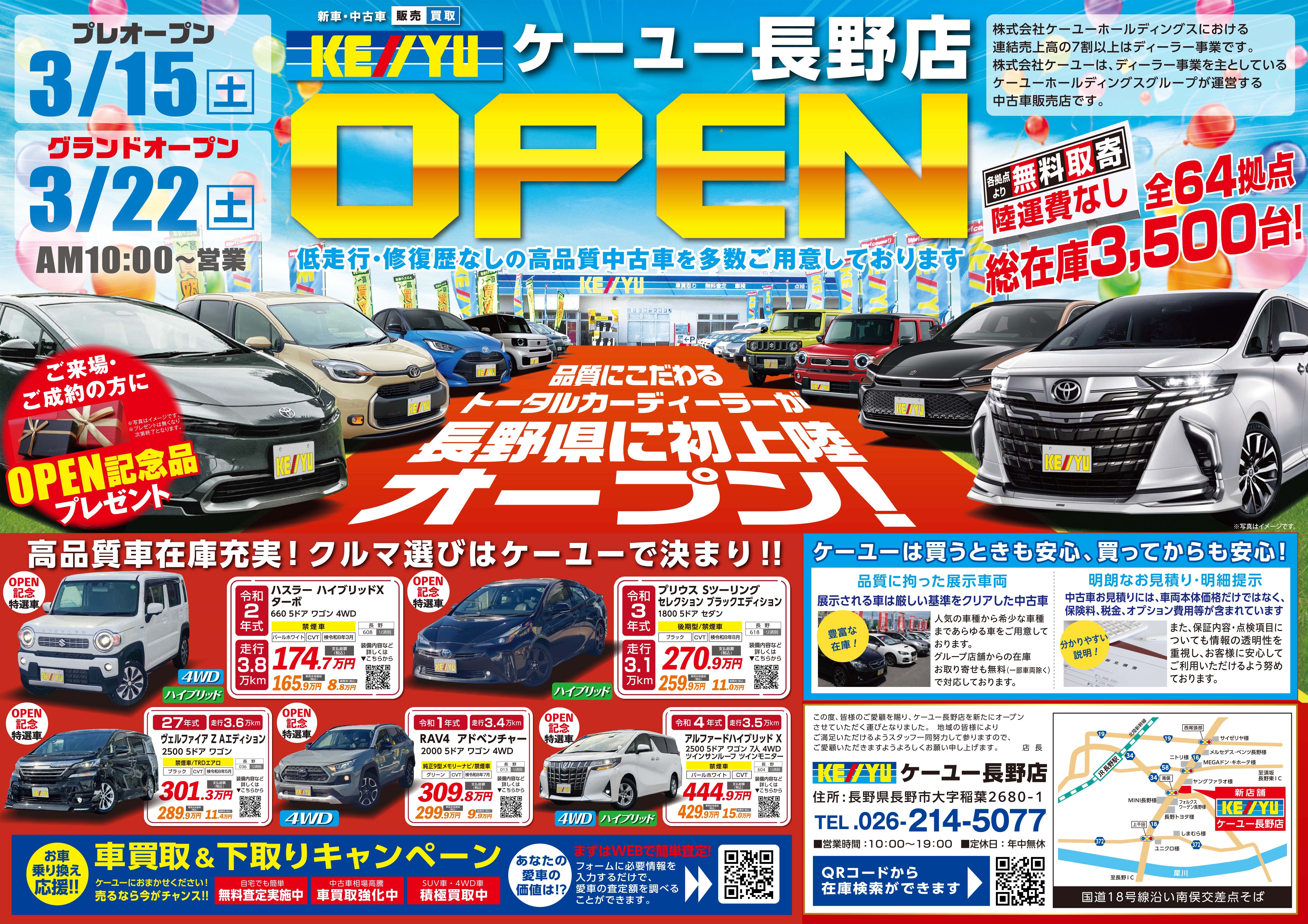 おかげさまで創業50年以上の信頼と実績、ケーユー長野店はおかげ様で1周年!『選べるから嬉しい、選べるから楽しい、選べるから納得できる!!』充実のあんしんバリュー保証等選べるメリット盛りだくさんでサービスをご提供するのが私達ケーユーです!自信の品揃えは店頭在庫はもちろん、全店総在庫が3500台以上という規模で陸送費用無料(一部車両を除く)でご案内、専門スタッフによる車選びのアドバイスや自社工場でのご購入後のメンテナンスサポートもしっかりとさせて頂きます!